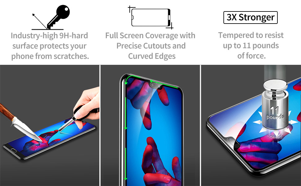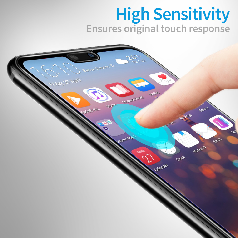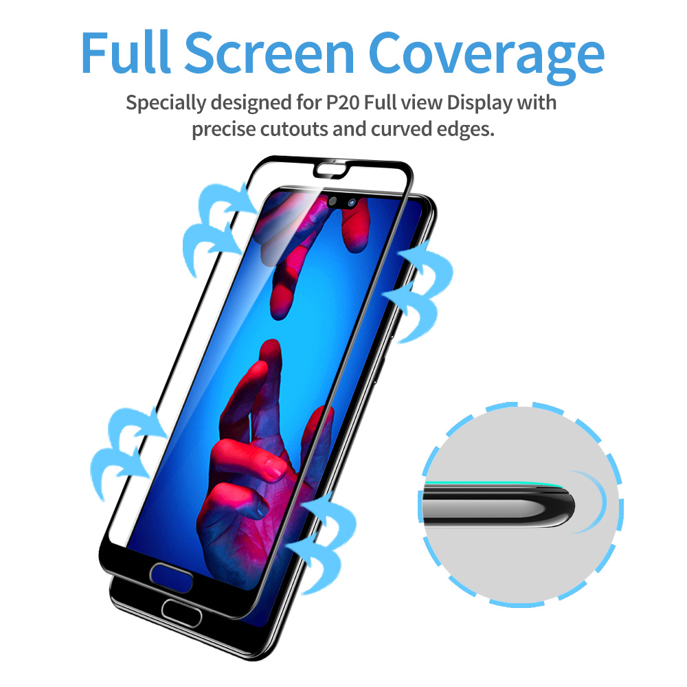 Özel olarak tasarlanmış tam kapsama ekran koruyucusu, Huawei P20’nin ekranını tozdan ve çatlamadan korumak için kavisli kenarları kaplarken temperli cam ekranın düz alanını kaplar.